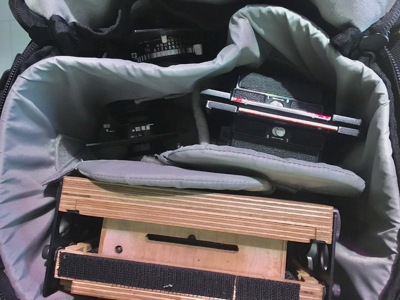 questa è la mia borsa dell’intrepid, due ottiche, due dorsi 6x7 e tutto quello che serve ancora (cavalletto sempre a parte): 4,5 kg