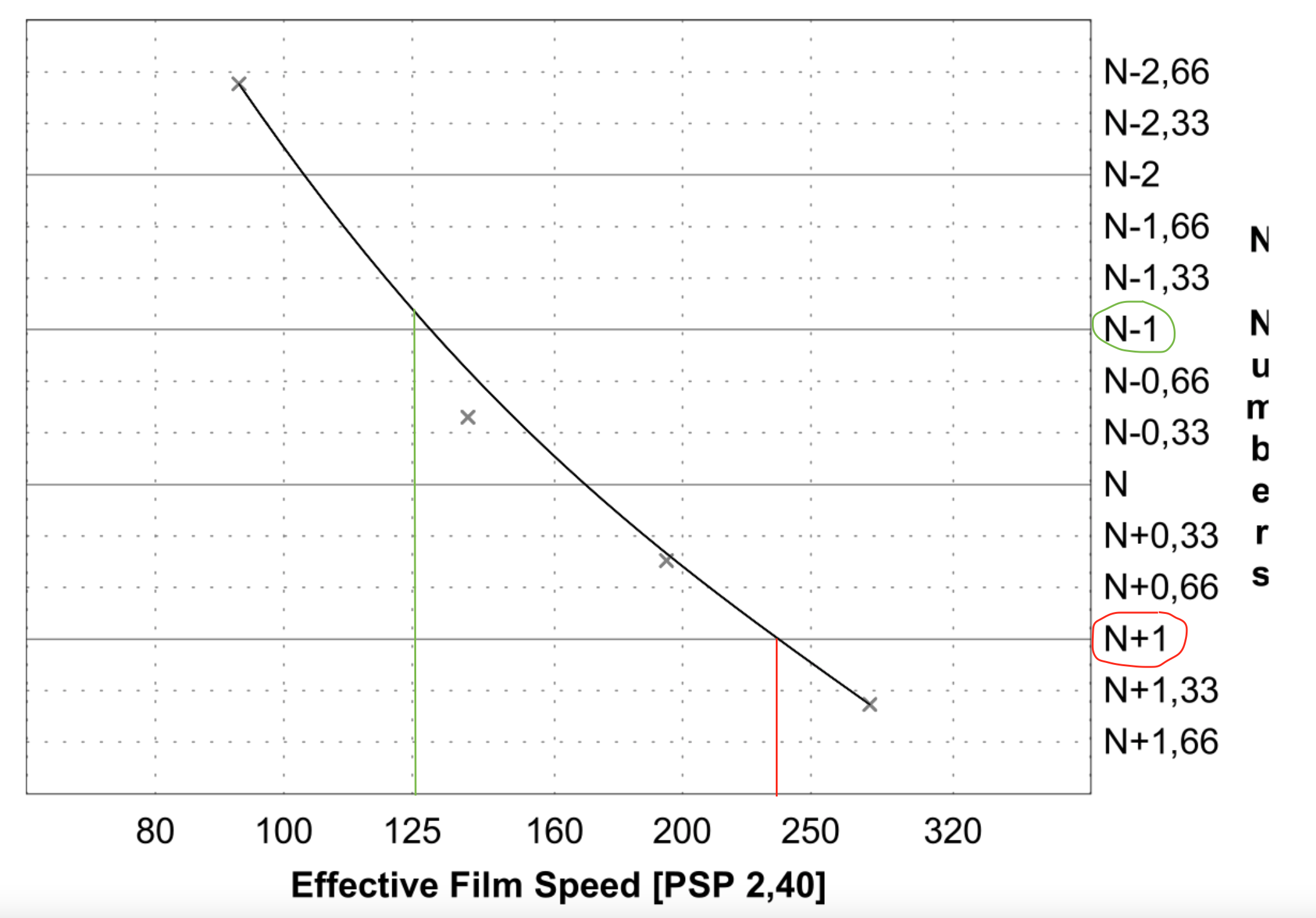 - i dati riportati sul grafico sono nell'ordine: tempo di sviluppo, sensibilità effettiva. gradiente medio e gamma di contrasto del soggetto (SBR) espresso in stop (soggetto N=7 stop)