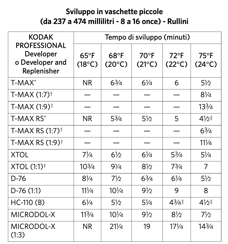 Non trovo nulla per i nuovi rulli AgfaPhoto. Mi sa che tocca provare così e poi affinare.Luca Ghedini ha scritto:Credo che la tabella riportata, così come quelle pubblicate da ILFORD e Kodak, esprima una regola generale che va bene per tutte le pellicole e tutti rivelatori.