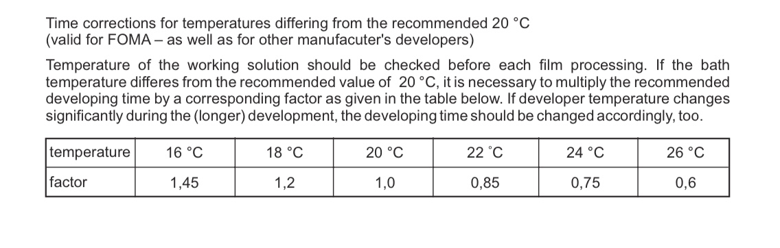 In pratica preparo subito la quantità di sviluppo con l’acqua come esce dal rubinetto e lascio che si stabilizzi con la temperatura ambiente, ne frattempo carico il rullo è faccio tutte le altre cose di preparazione. Infine misuro la temperatura dello sviluppo e applico il coefficiente. Per i valori intermedi interpolo.