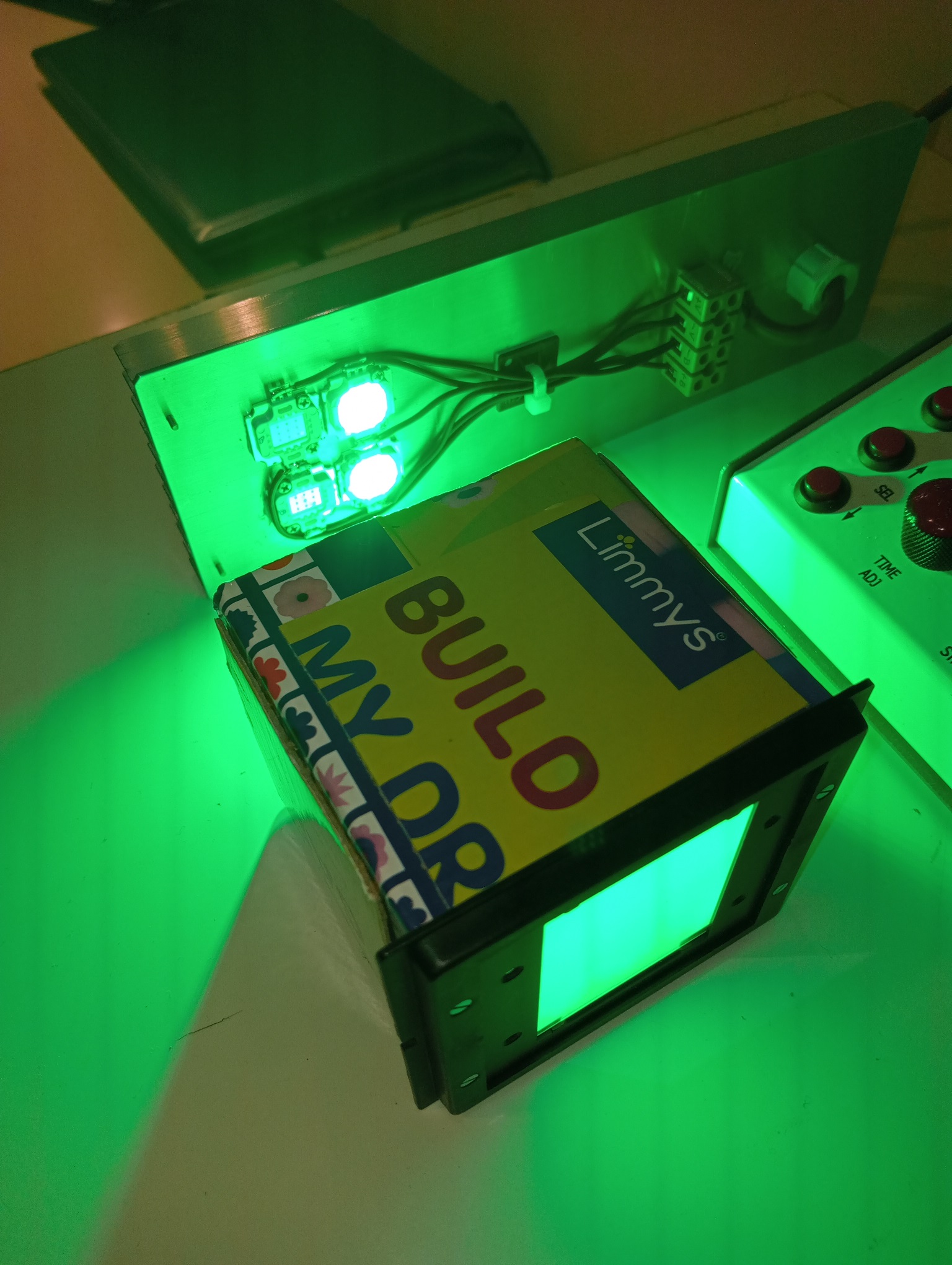 In questo box esterno c'era solo un piccolo Arduino, i driver per alimentare i led in pwm, il display, contrasto +/-, potenza +/-. 5V alimentazione in ingresso per il suo funzionamento, 12V in ingresso di potenza dal timer, 12V uscita verso i led. Ci ho anche stampato in questa configurazione di test.