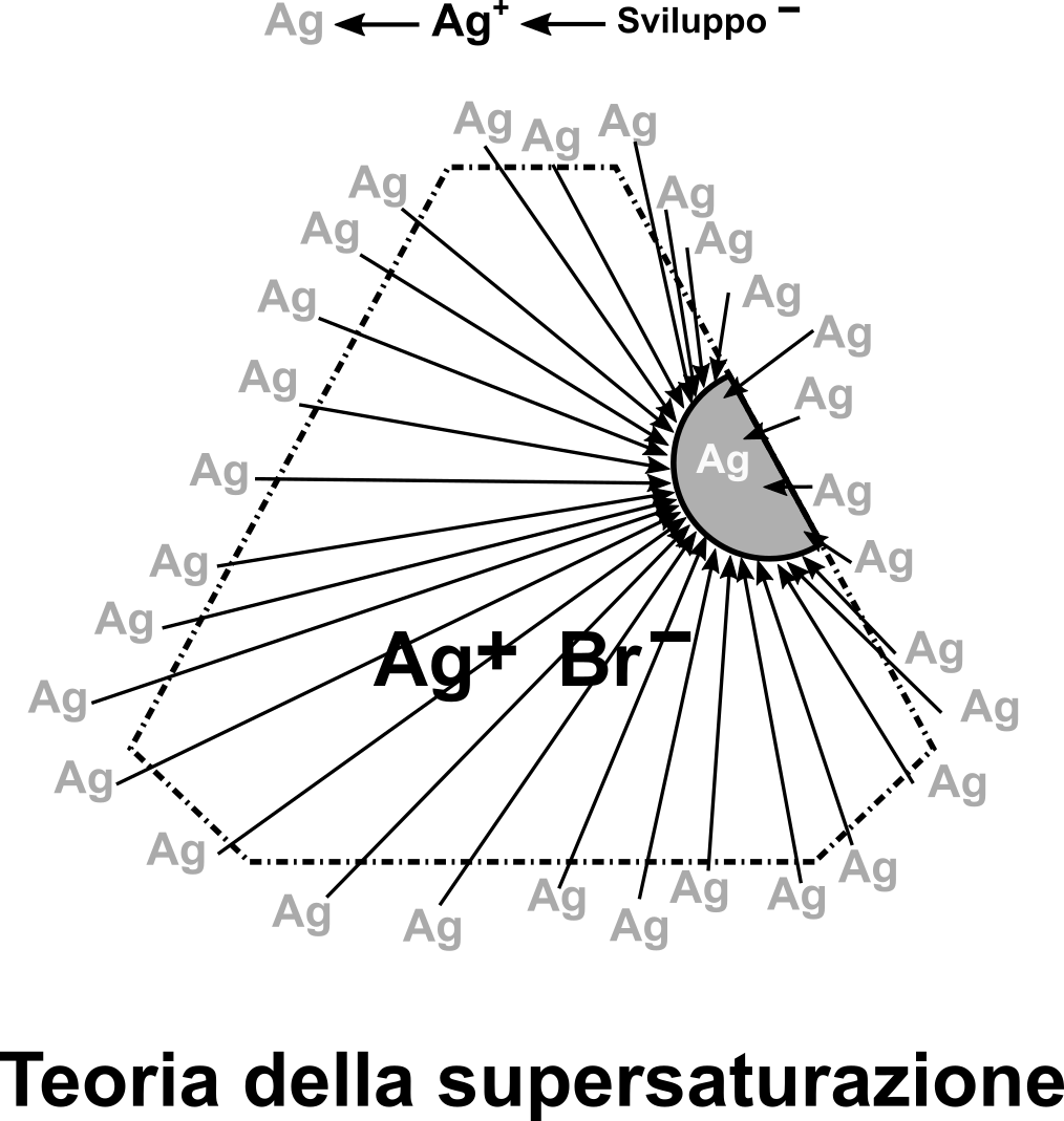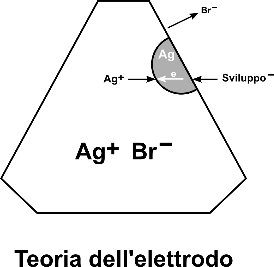 Nel granulo di bromuro d’argento colpito dalla luce invece il germe di sviluppo rappresenta un indebolimento nello strato di isolamento elettrico attraverso il quale si può aprire un passaggio a bassa energia per il trasferimento di elettroni (carica -) dal rivelatore agli ioni Ag+ che vengono ridotti ad argento metallico neutralizzando così la carica positiva che viene però ristabilita attraverso l’assorbimento degli altri ioni Ag+ presenti nel cristallo finché tutto l’argento presente nel cristallo non viene trasformato in argento metallico. Nel mentre gli ioni bromuro che sono presenti nel reticolo cristallino del bromuro di argento passano in soluzione nello sviluppo.