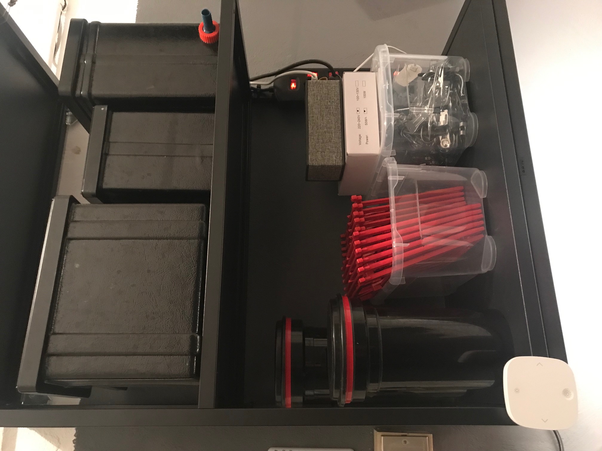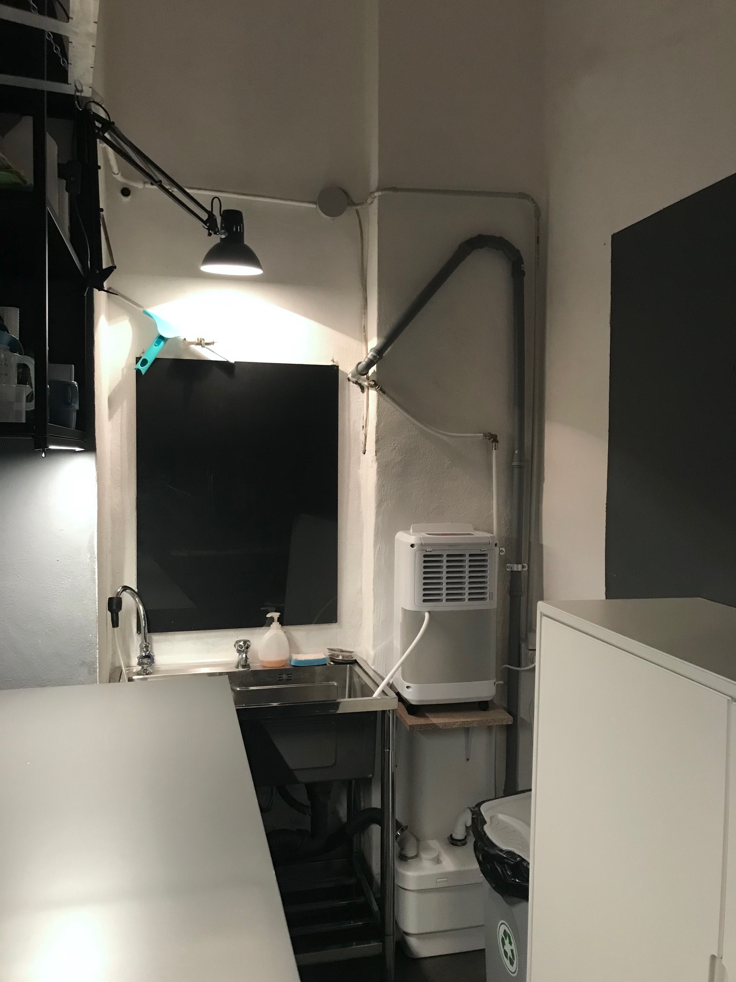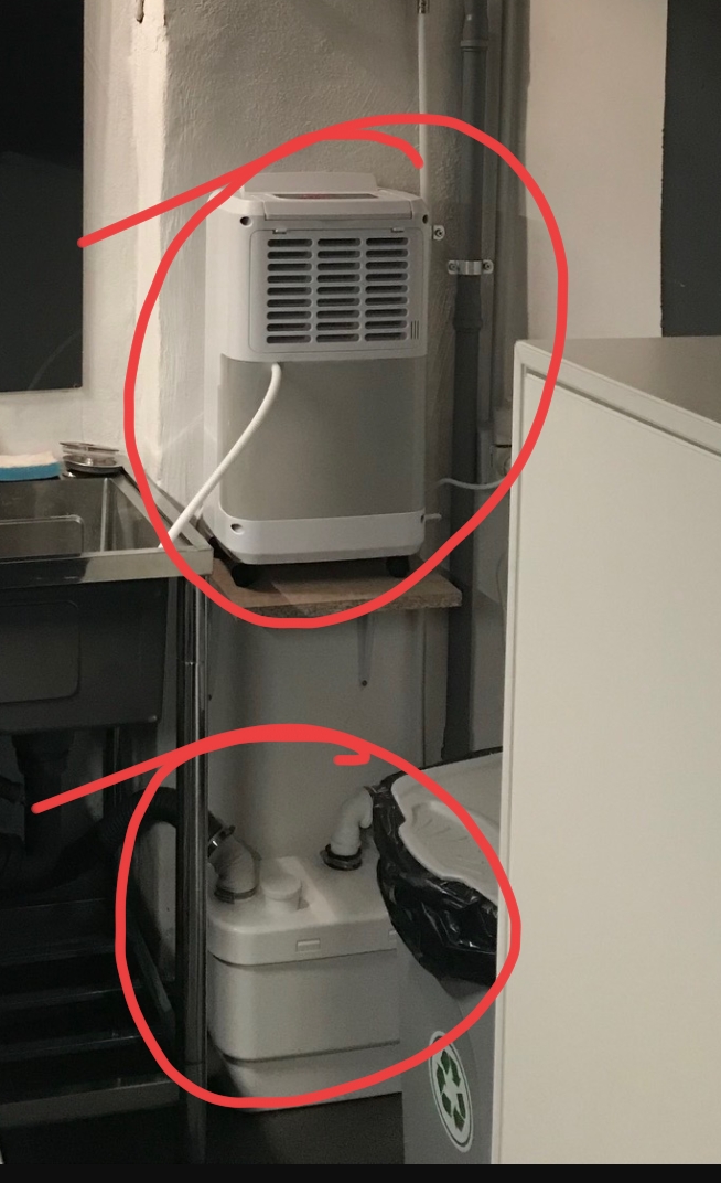 Una è la pompa che spinge l’acqua nello scarico, essendo la camera oscura sotto il livello terra non avevo il collegamento per scaricare l’acqua. L’altro è un deumidificatore, la stanza aveva delle infiltrazioni che avevano creato muffa, ho dato antimuffa ma avevo bisogno di abbassare il livello di umidità.