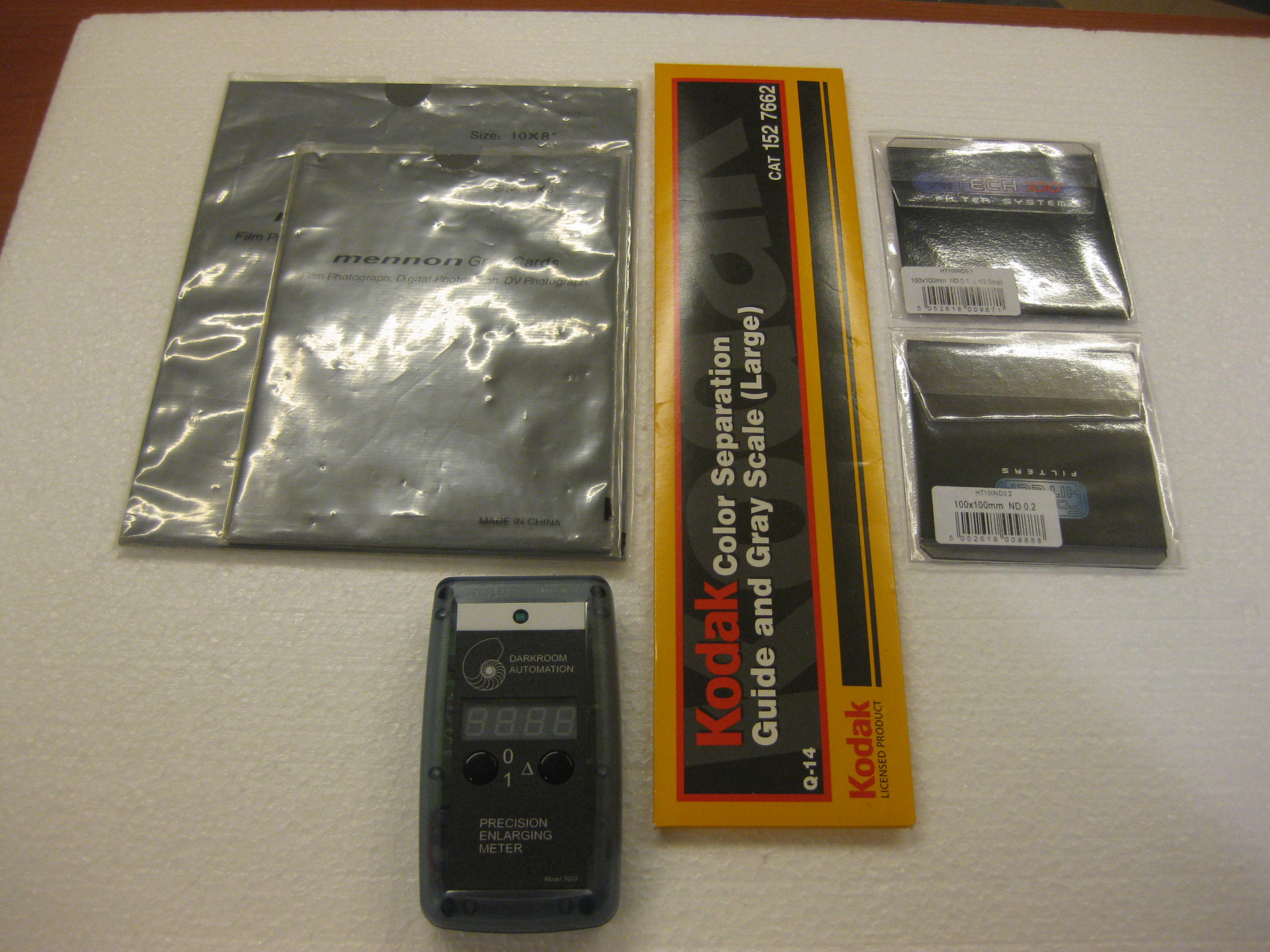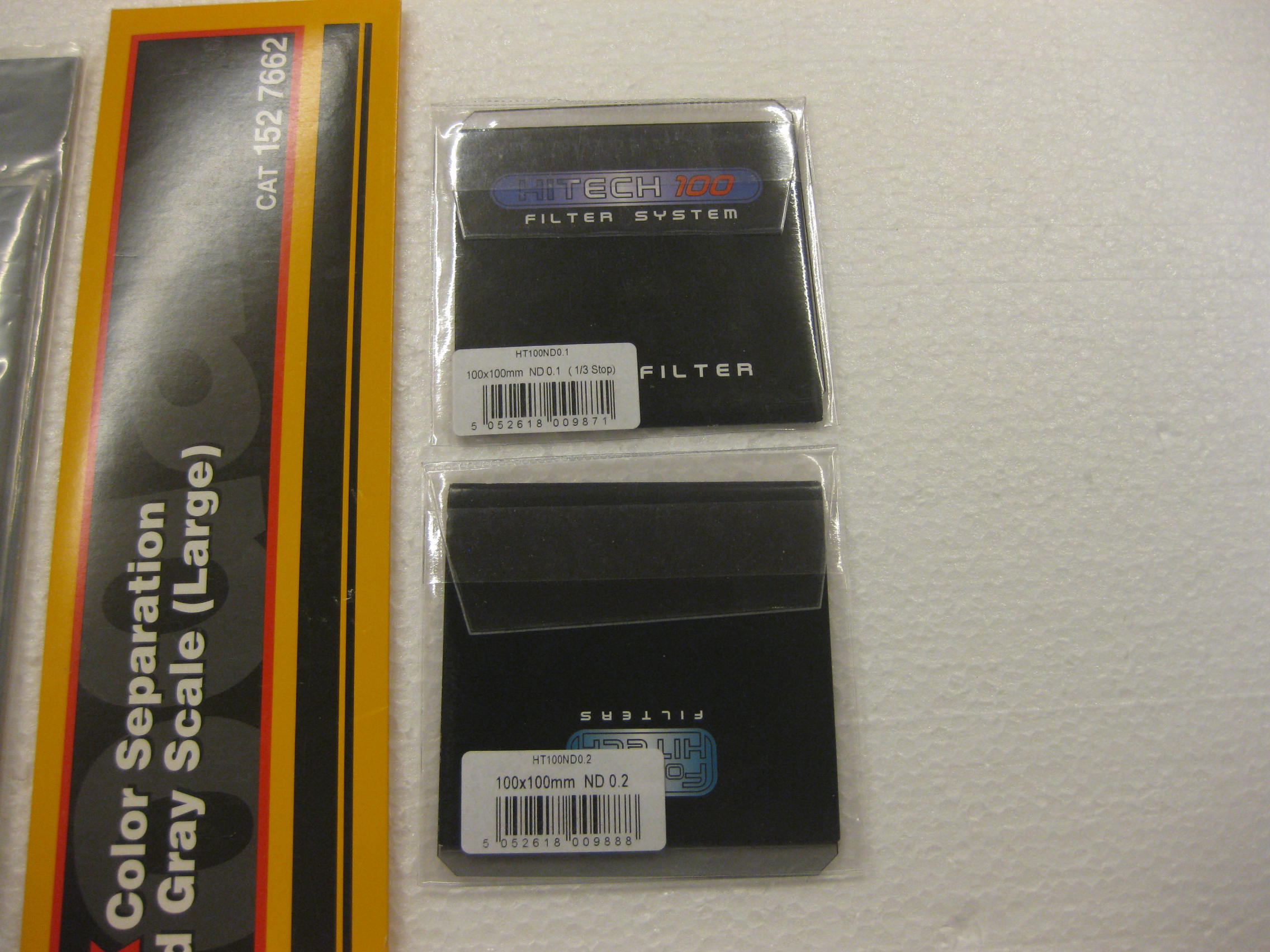2)[VENDUTO] Filtri Hitech 100 100x100mm 0.1, 0.2 ND tenuti benissimo, normali segni di utilizzo, scala Kodak praticamente nuova, oggetto misterioso della Darkroom Automation nuovo, due cartoncini grigi nuovi. 50€+S.S