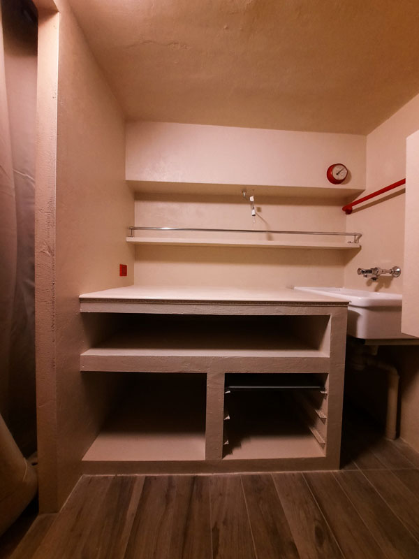 La parete divisoria con il vano di accesso e che forma la nicchia per l'IFF è realizzata in cartongesso come pure I piani di lavoro e I vani sottostanti.