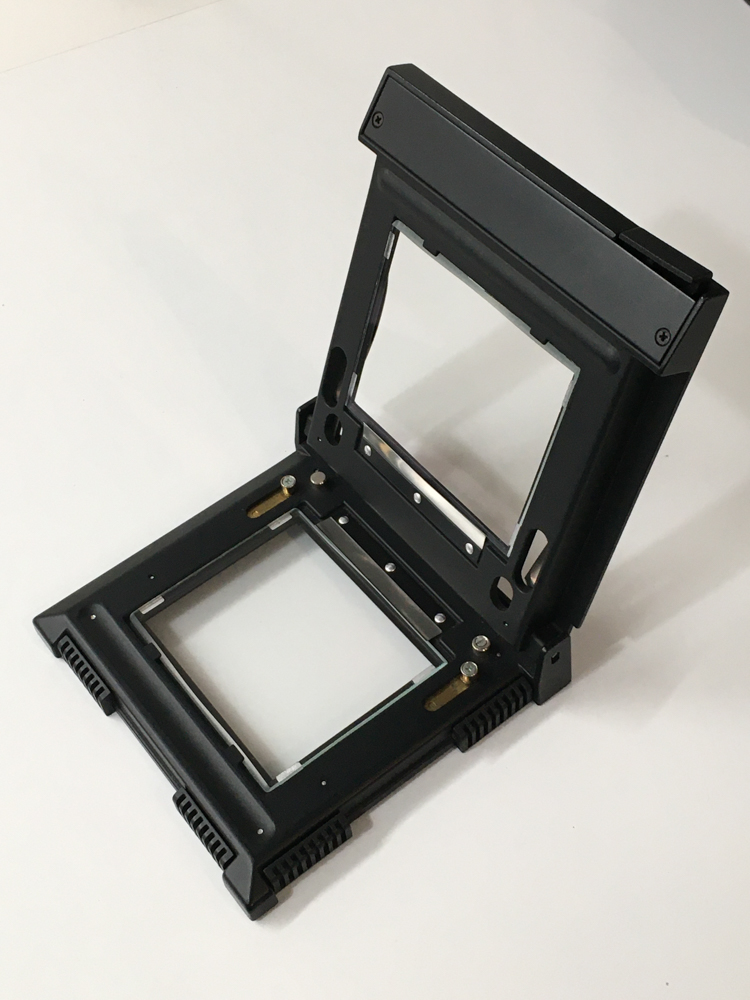 La testa contiene due camere di diffusione intercambiabili con lo spostamento di una leva: una per negativi 135 mm, un'altra per negativi 6x6 o 6x7.