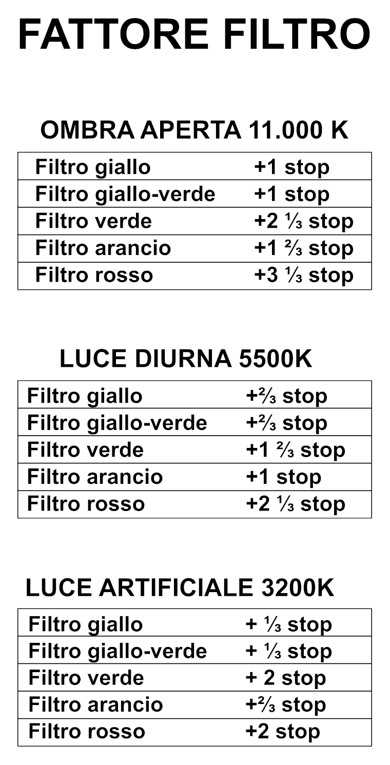Le prove sono state fatte sia usando i fattori filtro per la luce diretta del sole che quelli per l'ombra aperta, ma qui ripropongo solo il test fatto alla luce diretta de sole.