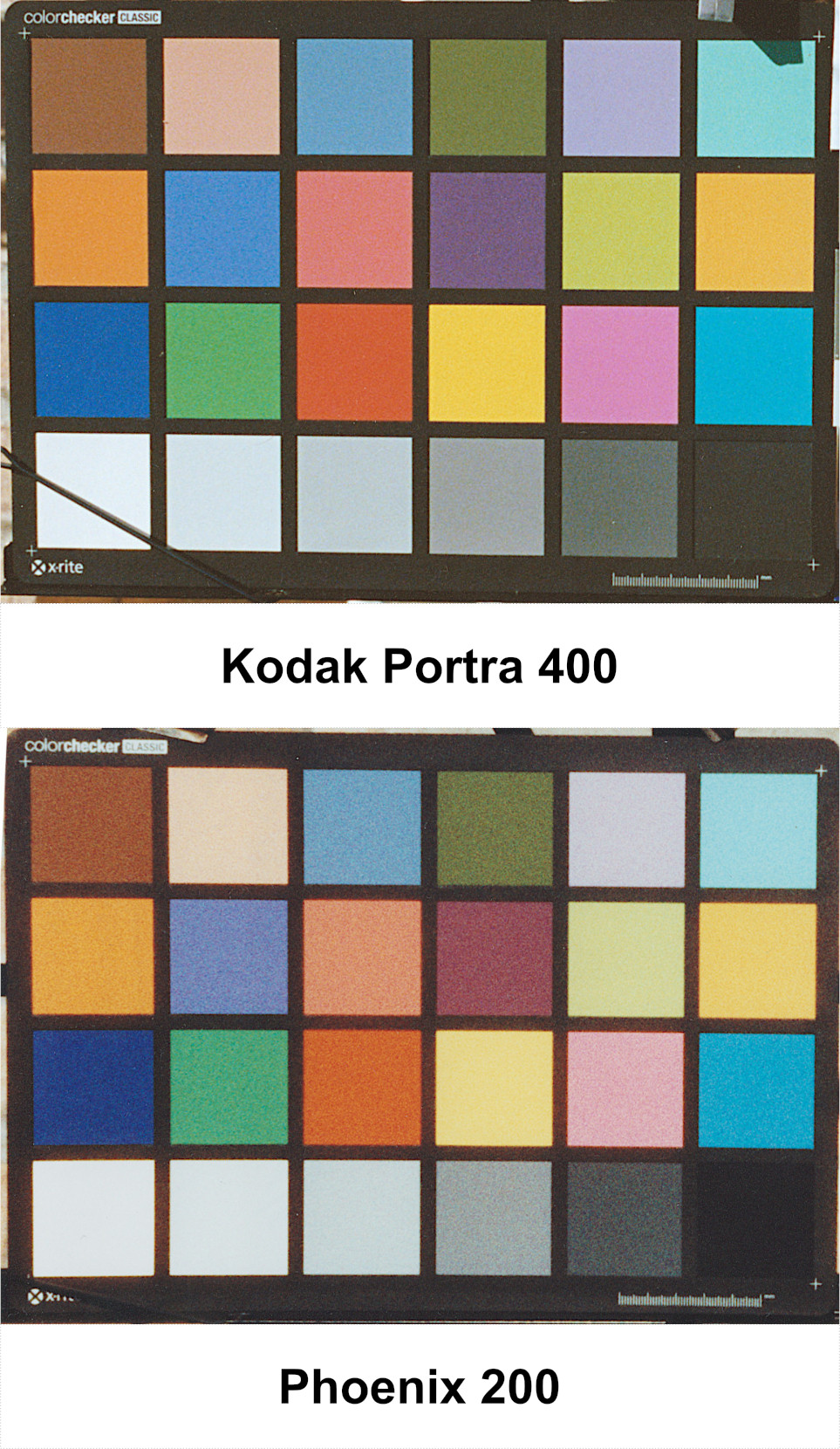 Il motivo per cui le pellicole negative a colori hanno la maschera arancione è proprio quella di compensare la risposta cromatica del copulante colore ciano che va a “sporcare” il giallo e il magenta. Questo comportamento è ben visibile dalla resa del colorchecker macbeth, in questa immagine messo a confronto con quella che è a mio parere la pellicola a colori con la resa cromatica più fedele, la Kodak Portra 400.