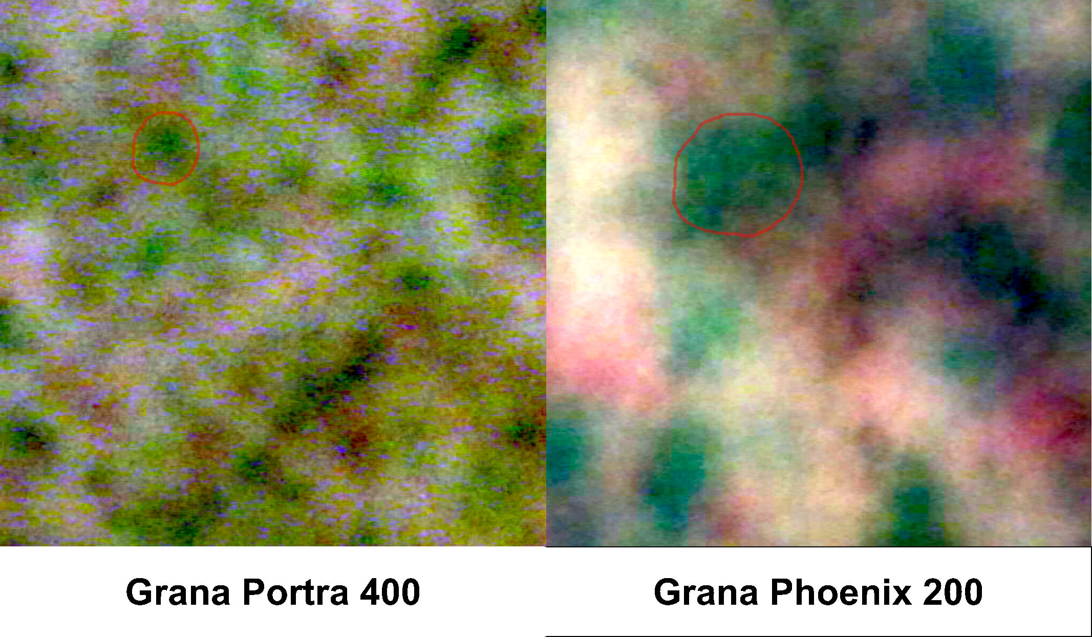Immagini al microscopio della grana della Phoenix 200 rispetto alla Portra 400. Anche se la pellicola della Kodak è tabulare mentre la Phoenix è a grana calssica, la differenza nelle dimensioni è imbarazzante.