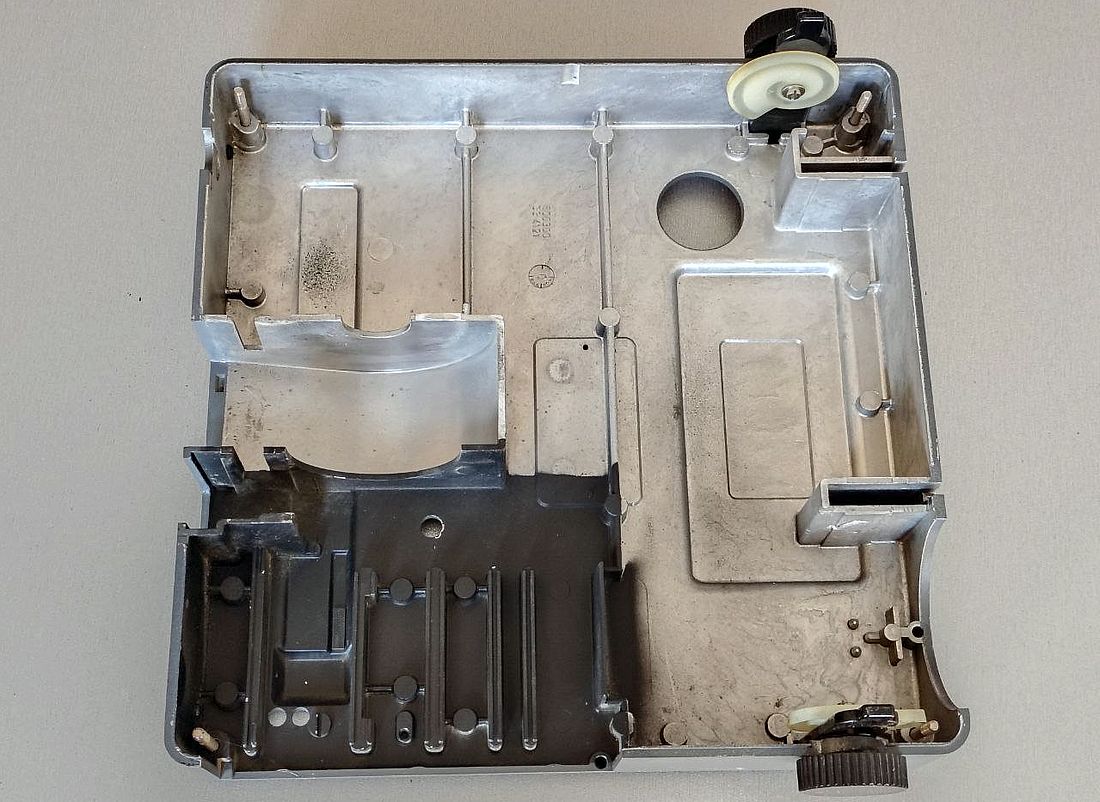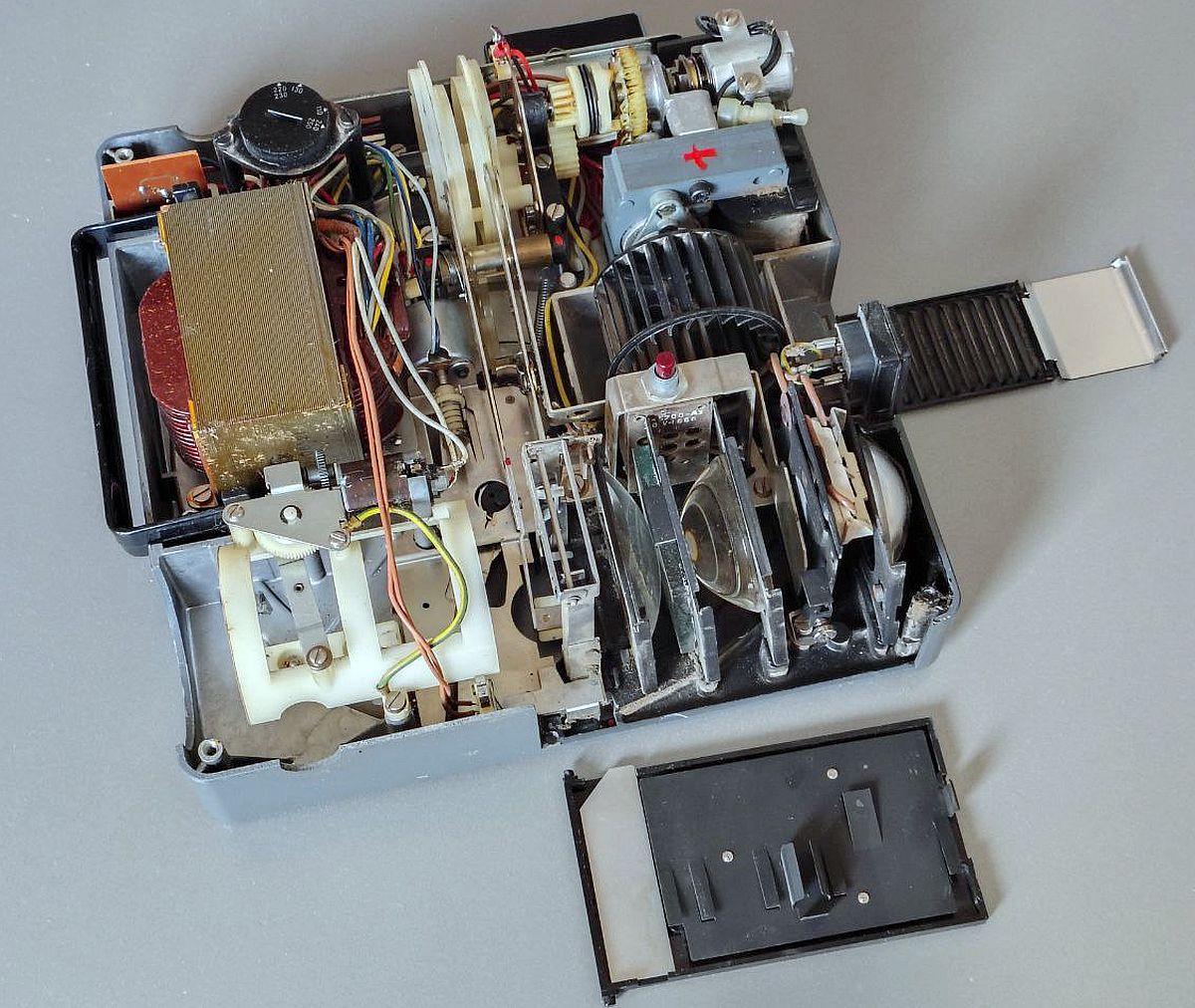 Il caricatore ha una parte inferiore metallica, che dopo montato sul proiettore resta ferma in una posizione definita, e una in polimero che rispetto a quest'ultima può ruotare comandata dal proiettore. Il caricatore ha 81 posti - uno inutilizzabile perché appositamente inibito da una sorta di tappo. Se il caricatore, pieno, viene tolto dal proiettore con selezionato il posto "0", a coperchio chiuso e bloccato nessuna diapositiva può cadere, proprio per ragioni geometriche. Chiamasi "oggettivazione della sicurezza". ora visto da sotto Apro ora (era da tempo da pulire...) il più semplice della serie S-AV, appunto un S-AV "e basta", uno dei due Carousel che mi son rimasti (l'altro è un 1030). Dopo svitato l'obiettivo, aver aperto lo sportellino dal lato lampada/ottiche e sfilato condensatori, filtri anticalore e specchio dietro la lampada, lo capovolgo su un piano e tolgo le quattro lunghe viti che vedi poggiate sul pezzo, che si fila pian piano sano senza alcun componente attaccato sotto. se lo osserviamo sul lato interno, è un unico robustissimo pezzo di pressofusione, la parte in nero opaco è verniciata, non riportata in plastica. Vedi anche i due intelligentissimi elementi "spiraliformi", degli eccentrici coi quali nell'S-AV e in tutta la serie 2000 si regola l'altezza della parte anteriore, separatamente in modo da poter compensare eventuali pendenze residue del trabattello o piano di appoggio e avere l'orizzontale perfetta in proiezione Adesso osserva nella sua globalità l'interno del proiettore, è denso di componenti, a guardare bene ordinatissimo. Più in basso in foto la parte ottica (illuminazione condensatori etc), l'obiettivo va a sx. Ho riappoggiato alla buona i condensatori etc per far vedere la disposizione. Vicini al loro posto lo sportellino della zona "calda" e la griglia di ventilazione. Quasi al centro a sinistra, vicino alla maniglia di trasporto (non estratta) il grosso trasformatore, molto ben dimensionato. Segnato al collaudo con un "+" il gruppo con l'unico motore, che comanda raffreddamento e avanzamento SENZA CINGHIA ALCUNA, solo integrato da ingranaggi, demoltipliche a vite senza fine e solenoidi. La "filiera ottica" con un obiettivo 85 riavvitato in sede. da SX obiettivo (si vede il motorino per la messa a fuoco a filo, sull'S-AV "puro e semplice" no autofocus), il castelletto in cui scende la diapositiva, il condensatore anteriore che per focali dell'obiettivo superiori a 200 mm si sostituisce con quello dedicato, il filtro anticalore azzurrato e spessissimo, condensatore posteriore con vicino il termostato di sicurezza antisurriscaldamento e il suo pulsante di test, portalampada, all'estremità dx vicino alla presa di corrente lo specchio posteriore: cristallo alluminato e quarzato. La stessa sequenza smontata e messa in fila; stavolta a sx un obiettivo Retinar da 180 mm Tutti i Carousel che montano UNA sola lampada (e non due intercambiabili per scorrimento) permettono di ribaltare il suo telaietto di supporto verso l'esterno, aprendo lo sportellino zona condensatori, senza disassemblare nulla. Rammenta che stai vedendo tutto capovolto perché quel che è stato smontato è il fondo. Adesso guarda l'altra parte: vedi il cambiatensione (da un certo modello in poi su quelli distribuiti in Europa non lo trovi più), il motore di prima di cui si intravedono i DUE assi di presa di forza: l'inferiore verso la ventola di cui si vede un pezzetto, quello superiore nella foto con una demoltiplica a vite senza fine fa girare lentamente, tutto il tempo degli ingranaggi disaccoppiati: quando dai con uno dei due pulsanti sopra o il telecomando a filo (o un timer esterno dà, o una centralina esterna invia attraverso la presa multipolare che è su un fianco) il comando di avanzamento/arretramento, il solenoide all'estremità dx in alto nella foto richiama un asse e si accoppiano "per un giro" degli ingranaggi che azionano i grandi dischi a eccentrici di color avorio, sulle cui piste - quando è dritto, in posizione di lavoro - SOLO PER GRAVITA' (niente molle che si possono snervare o altro...) aderiscono tre lunghe leve fulcrate, connesse al riposizionamento nel caricatore della dia già proiettata, all'oscuramento della lampada per non fare la schermata "bianca" che abbaglierebbe la platea fra l'una e l'altra, all'apertura o delicato serraggio del vano in cui "cade" la dia, all'abbassamento e posizionamento della diapositiva successiva nel treno ottico. Niente microprocessori, niente circuiti stampati flessibili, nessun sensore elettronico (quello contro il surriscaldamento è un'affidabile termocoppia), una resistenza col codice colori leggibile e un transistor con la sua sigla su una basetta di vetronite... un condensatore... fili tutti ben distinti per colore; schema elettrico, son convinto, reperibile in rete. Questo ha matricola 070023, e ancora manca il fusibile accessibile dall'esterno