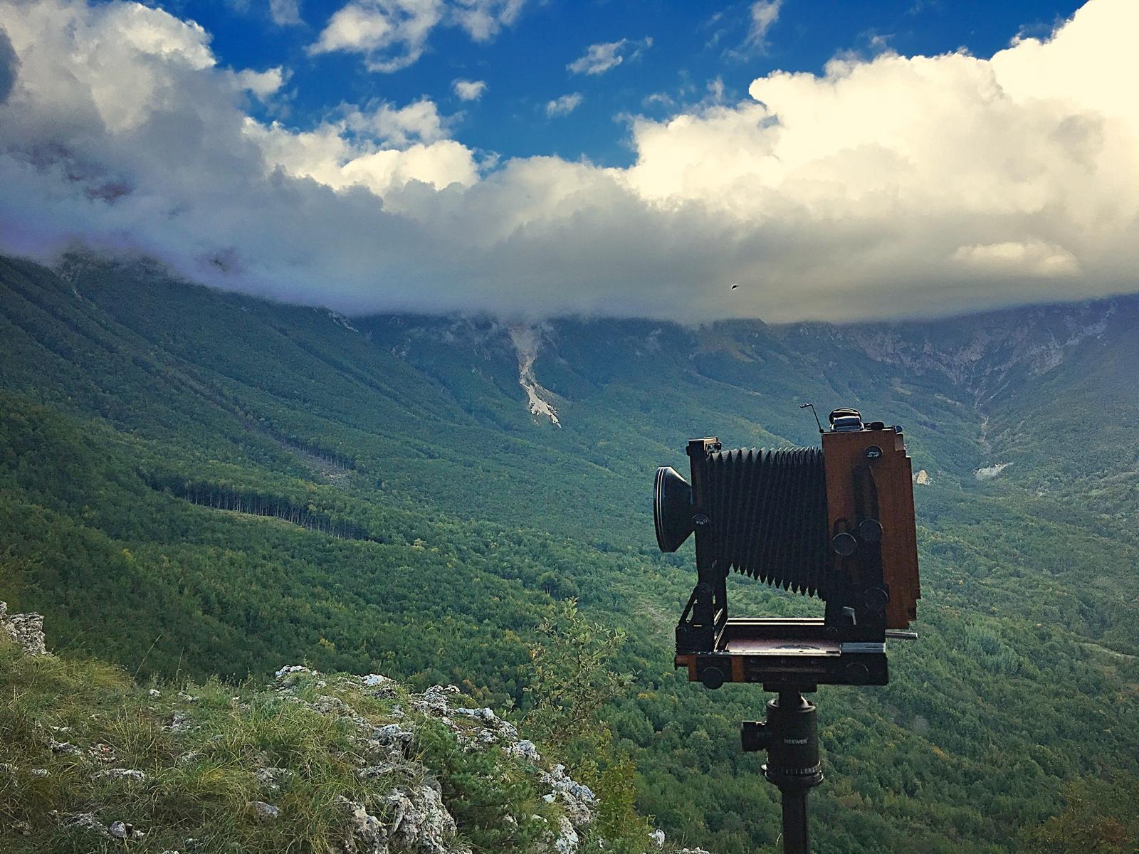 La storia: sono le 5.30/6.00 di mattina di fine settembre, 5 gradi scarsi, quasi 2000m. Il cielo fa pietà e qui ci posso tornare altre volte durante l'anno, ma già che mi sono svegliato un paio di lastre le faccio lo stesso e poi vedremo (mal me ne incolse). La scena è quella che vedete sotto, anche se il telefono la rende più chiara di com'era: ovviamente non ho appunti, ma non c'era un gran contrasto. Ho probabilmente misurato il prato in basso e piazzato in zona III stando un po' generoso, fp4+ a 80iso, parte illuminata della montagna probabilmente stava dalle parti della VI, cielo facesse quello che voleva.