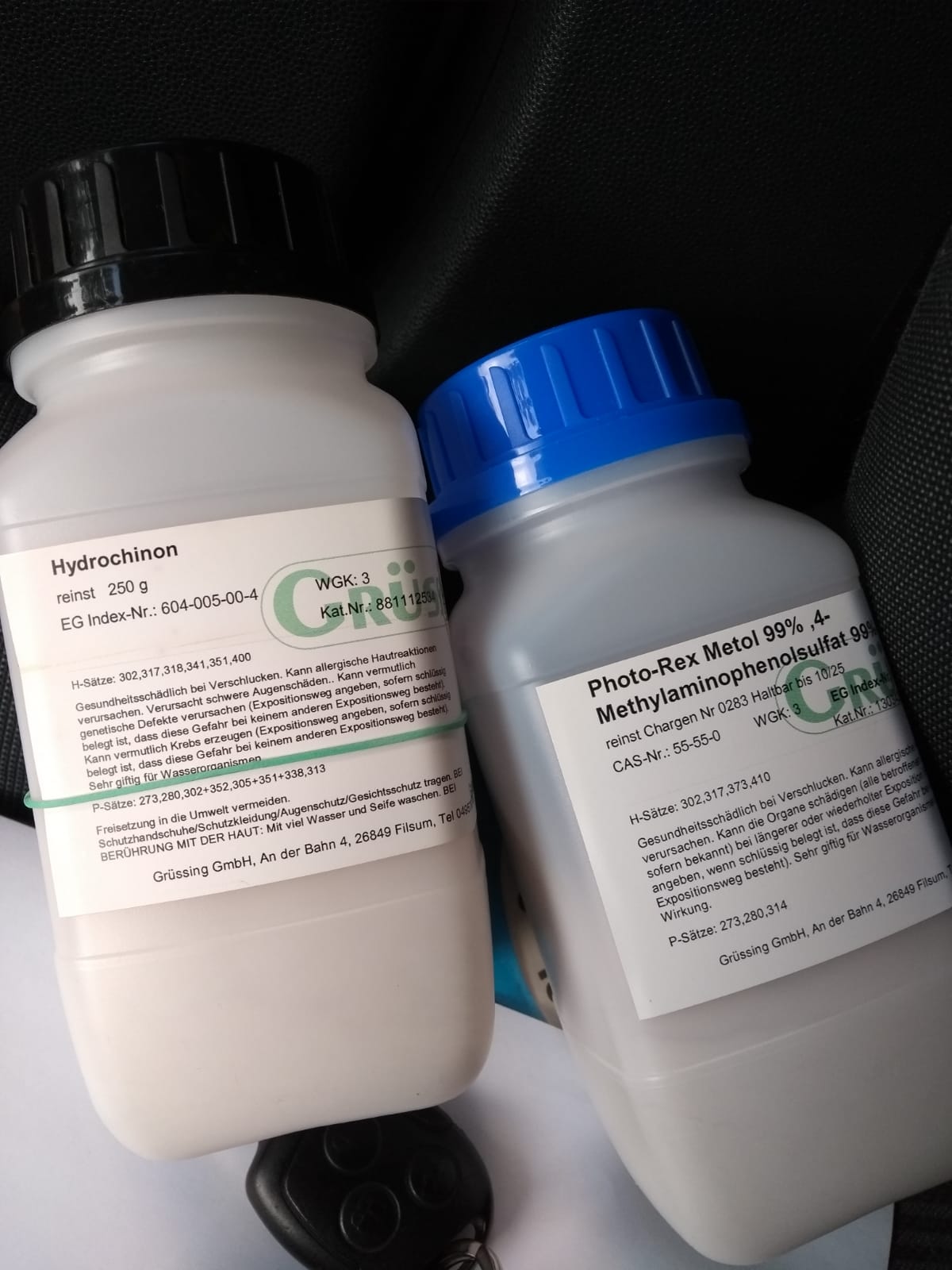 non mi sono fidato di comprare il metolo e l´idrochinone su Ebay, visto che in vecchie discussioni si parlava di chimici di dubbia provenienza, per cui li ho ordinati presso un negozio di chimica vicino a casa mia: