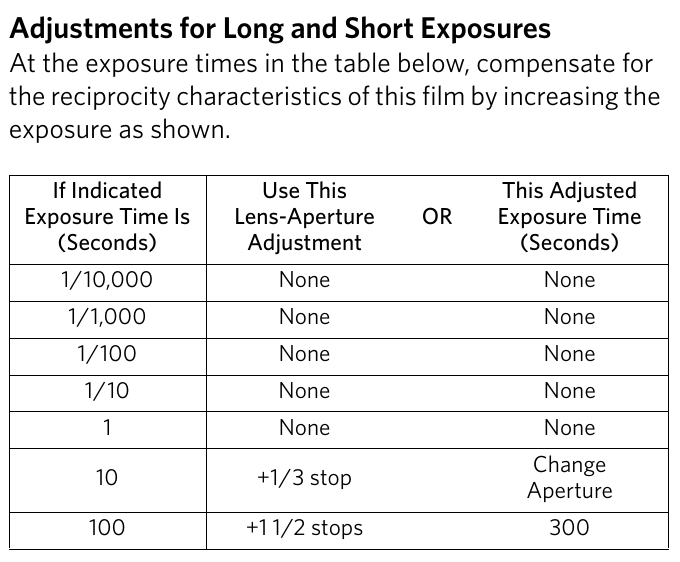 La correzione del difetto di no reciprocità dipende dalla singola pellicola, le uniche fonti sono le indicazioni fornite dai produttori ma in molti casi ci sono state testimonianze della poca affidabilità dei dati che non sono stati aggiornati da decenni, al contrario delle pellicole che nel frattempo sono cambiate. Si trovano on-line tabelle e/o test fatti dagli utenti e alcune app per telefoni o dispositivi. Personalmente mi sono trovato bene con Reciprocity, per questo l'ho consigliata, avendola usata spesso per delle macro in GF ma quando si lavora fuori reciprocità, a meno di non aver fatto dei test specifici, bisogna essere consapevoli di trovarsi nel campo dell'indeterminazione per cui le tabelline devono essere considerate un punto di riferimento dal quale partire per un numeroso e ampio bracketing.