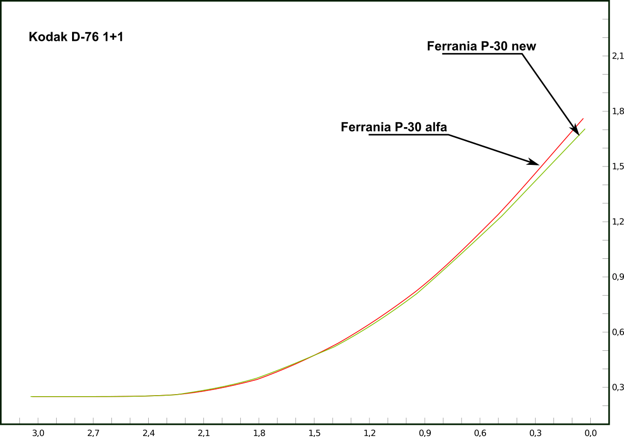 Qualche settimana prima della distribuizione della nuova P-30 ho avuto la possbilità di poter testare in anteprima un paio di rullini di pre-produzione e tutto il cappello scritto sopra si è reso necessario perché la nuova P-30 è sostanzialmente la stessa pellicola della versione alfa per cui rimando ai due link sopra per le curve caratteristiche e le curve contrasto/sviluppo; non avrebbe avuto senso ripostare un test sostanzialmente identico a quello già fatto. A dimostrazione publico qui sotto due curve caratteristiche per lo stesso tempo di sviluppo (8 minuti) E' abbastanza evidente che l'inviluppo della curva è sostanzialmente identico tranne una leggera divergenza nella parte alta della curva forse causata da tolleranze nella procedura di test o da lotti differenti di prodotto.