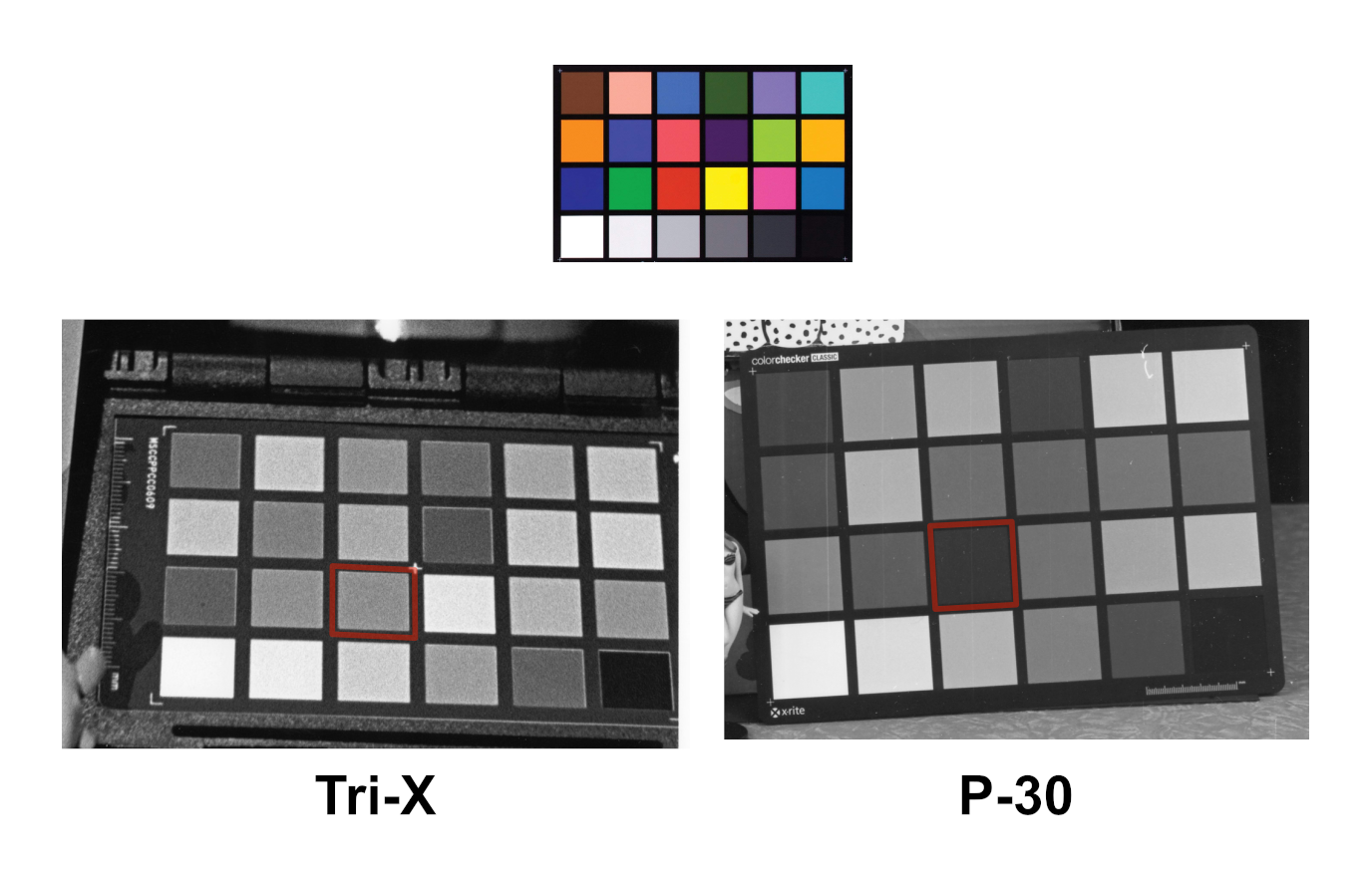 Non avevo uno scatto di un color checker fatto con un'altra pellicola ma ne ho preso uno dal web, una Tri-X e, con le debite cautele di un confronto poco ortodosso, le differenze sono lampanti.