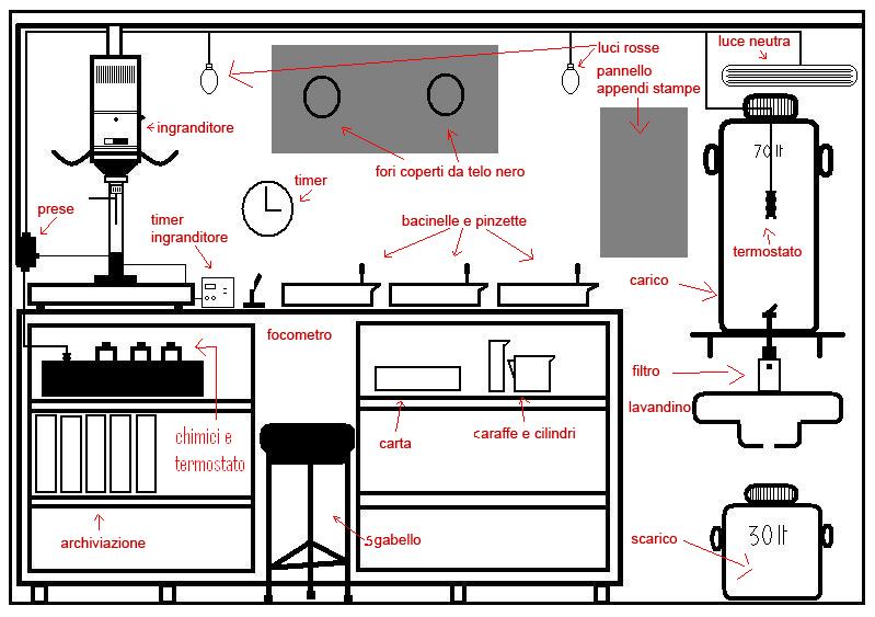 io ho per la zona asciutta sotto ad un grande tavolo x l'esposizione della carta 3 cassettiere dove é inserito materiale inerente alla zona asciutta (carta, pellicole, bobinatrici, estrattori, obbiettivi etc. etc.) sotto gli altri tavoli per la zona umida ho una cassettiera con tank, spirali, termometri, caraffe etc. etc. senza la presenza di "macchinari elettrici" in questa zona...