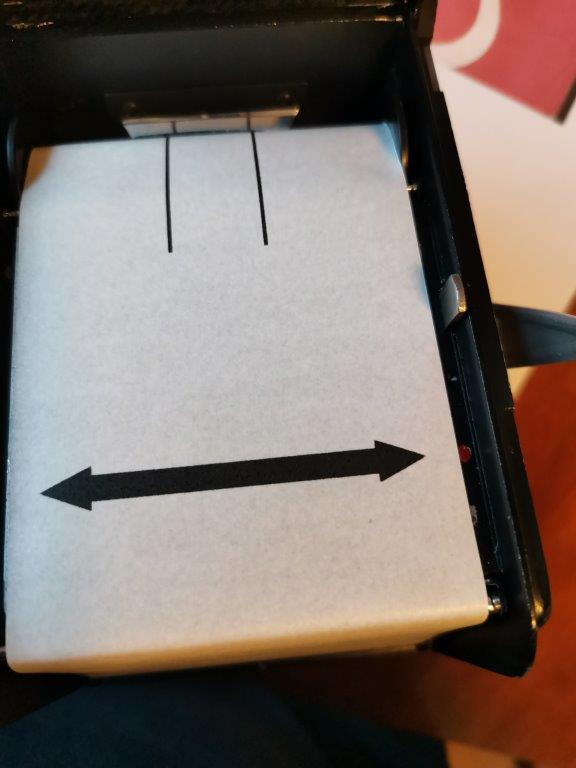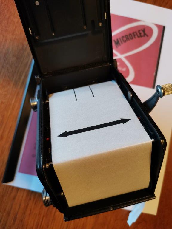 3) si inserisce il rullo vergine, ruotando la manovella di caricamento, fino a far coincidere la freccia stampata sulla carta protettiva, con i punti rossi segnati a lato della finestra del fotogramma;