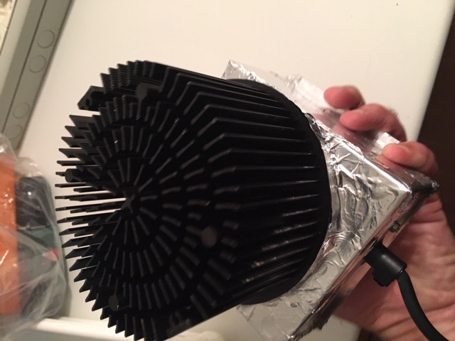 Qui ci ho installato il cob led da 40w, con dietro il dissipatore ed entrambi debitamente accoppiati con pad termoconduttivi.