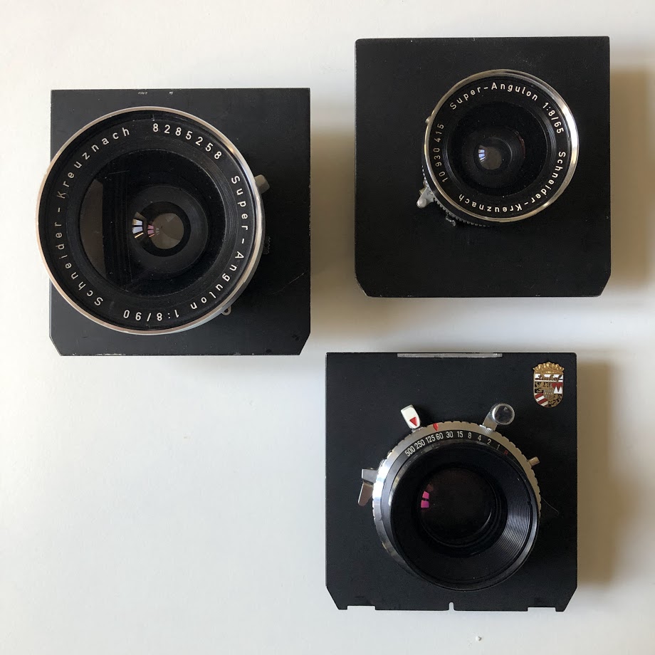 - Schneider-Kreunznach Super-Angulon 65mm f/8: obiettivo supergrandangolare montato su piastra artigianale (compatibile Linhof)