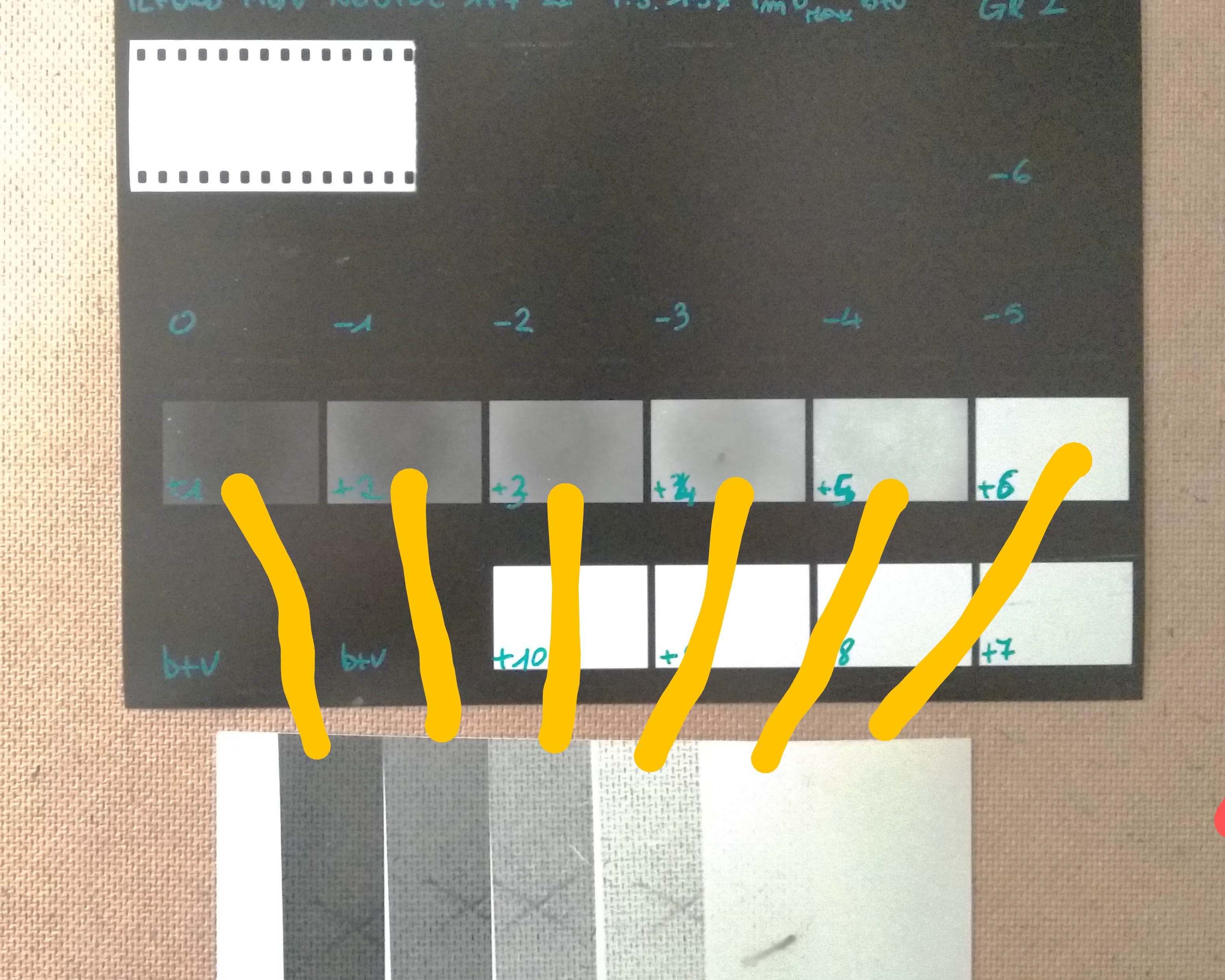 Beh è quasi nero. Rimetto qui sotto la foto del provino per proiezione perché forse non era chiaro che andasse dal +1 al +6. Quindi il ft0 si vede solo sul provino per contatto. Su tutti i provini a contatto ho scritto su ciascun fotogramma l'esposizione con cui è stato scattato; forse si vede meglio se apri ciascuna immagine per vederla grande: vedrai che il ft0 è sempre nero o quasi ( certo varia un po' con lo sviluppo e il grado di stampa come giustamente notavi tu).